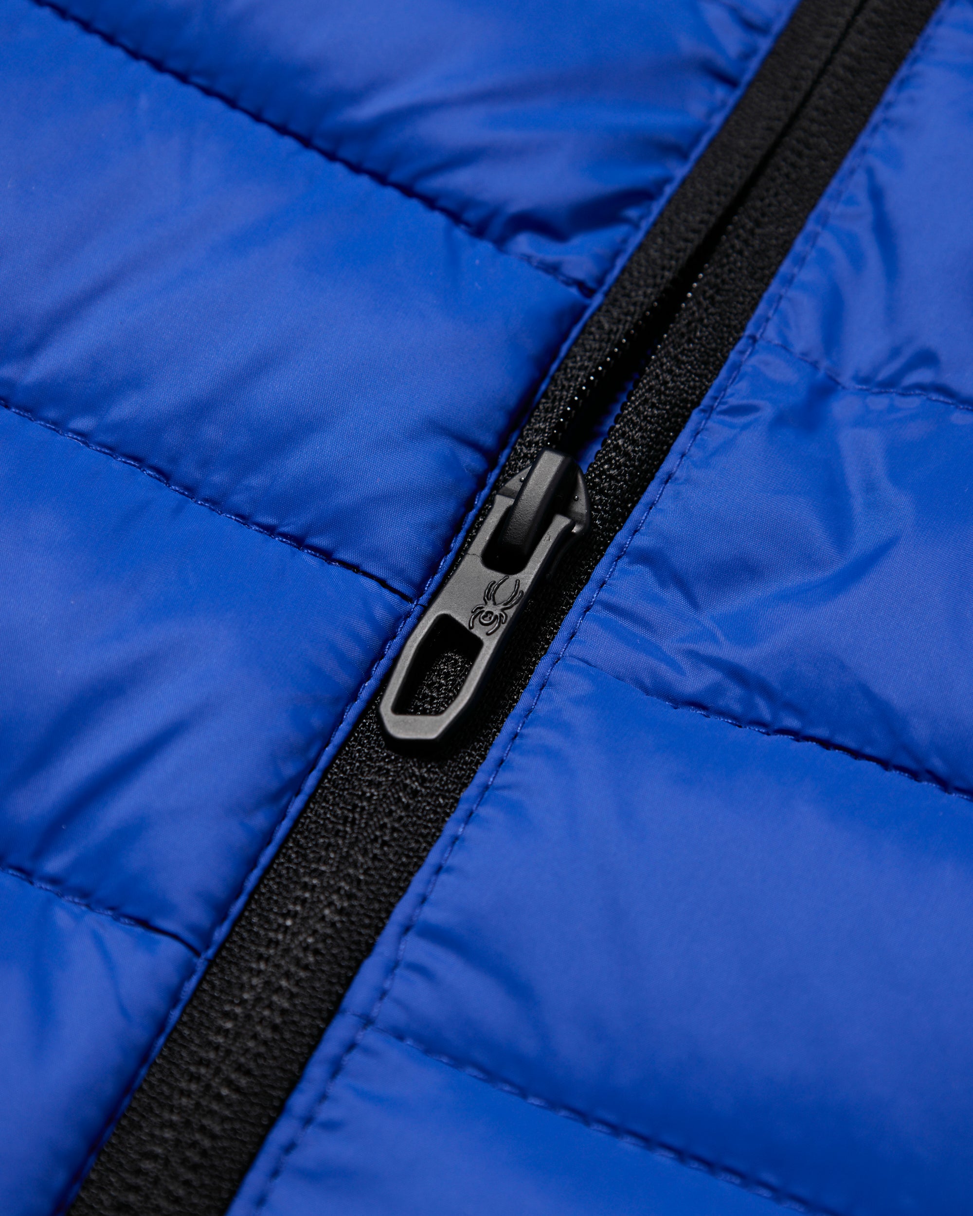 Close-up of a blue puffer jacket with a black zipper