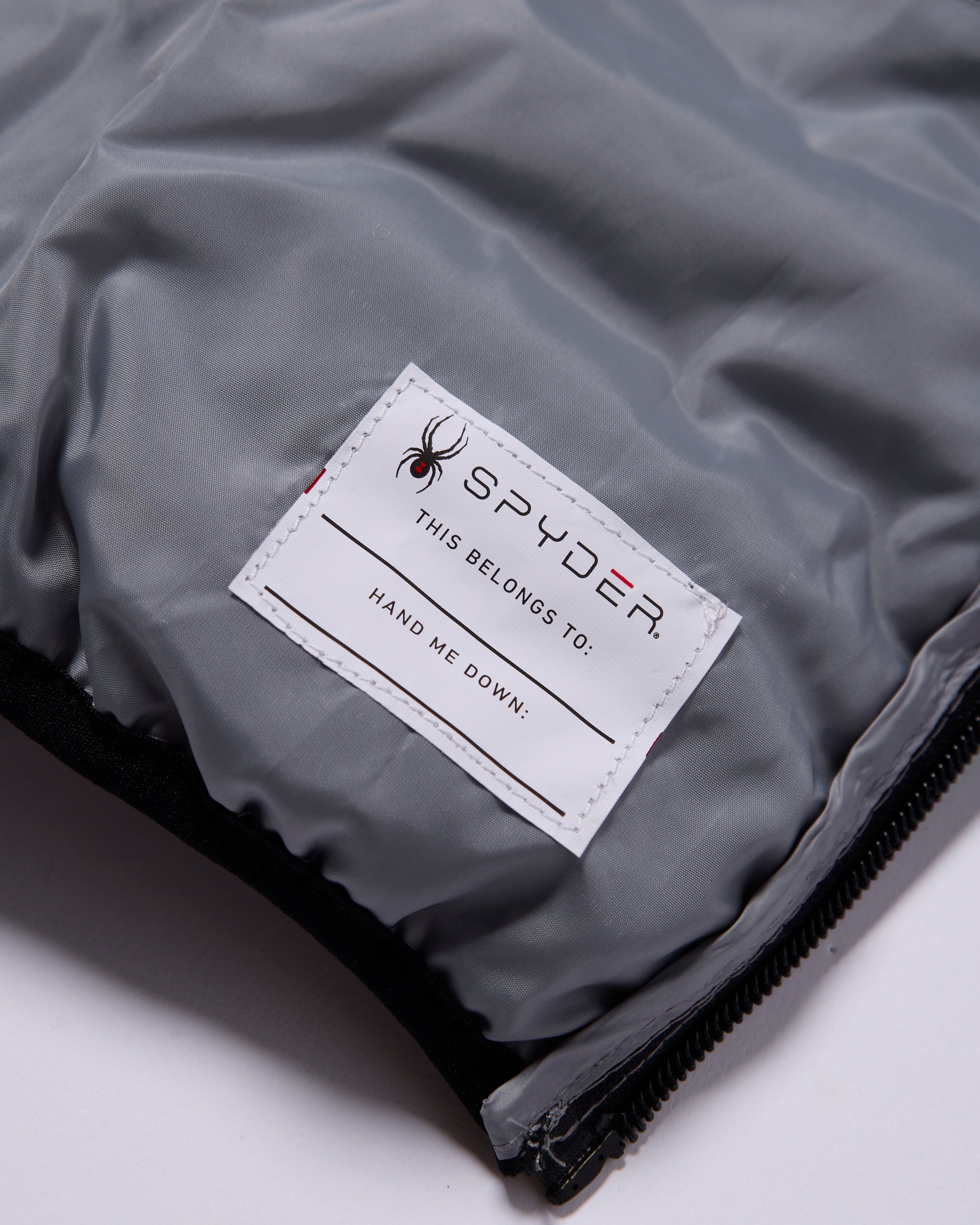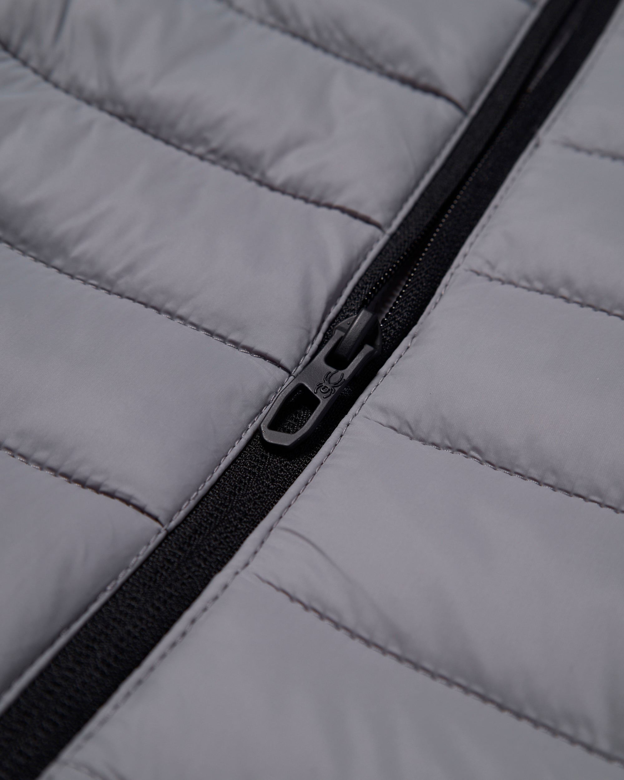 Close-up of a gray puffer jacket with a black zipper and Spyder label.