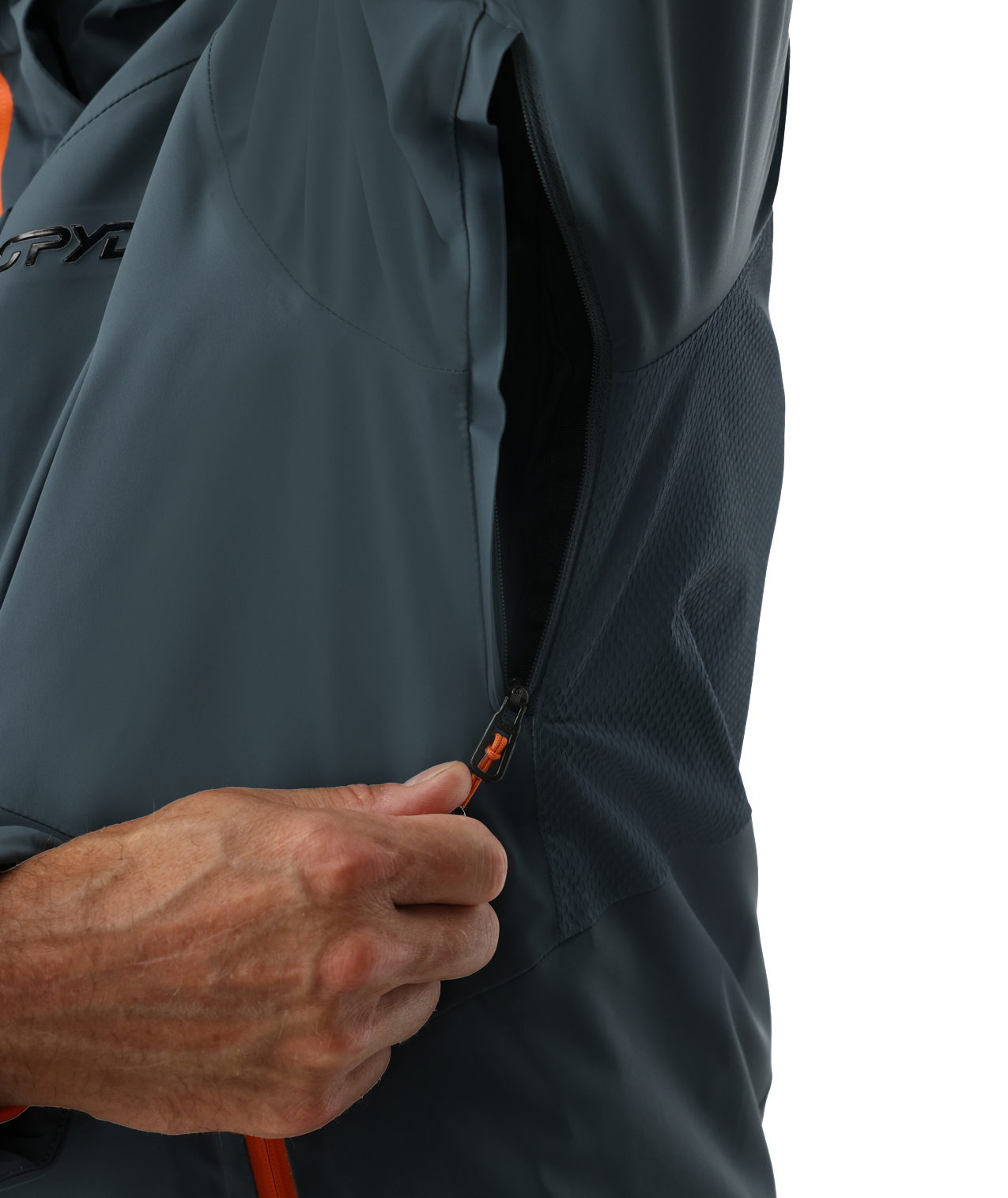 The brand-new Alyeska jacket is packed with specialty features to help maximize your time on the mountain. The 4-way stretch outer, strategically placed 2-way high stretch panels, and full stretch engineered interior allow you to easily twist and turn. At the same time, the EXO SHIELD 30K laminate, Durable Water Repellent coating, RECCO® Avalanche Rescue System, removable powder skirt, and fully sealed seams help keep you dry through your powder days. The PrimaLoft® Silver ECO insulation (60 grams) and underarm ventilation system keep you at just the right temperature, and you'll have storage for your on-mountain essentials with chest and hand pockets, a data card pocket, and two different interior pockets.