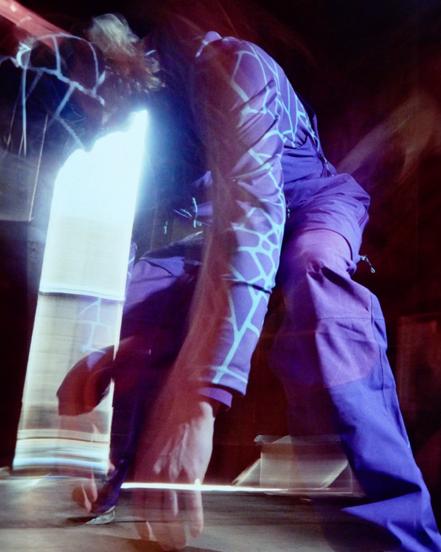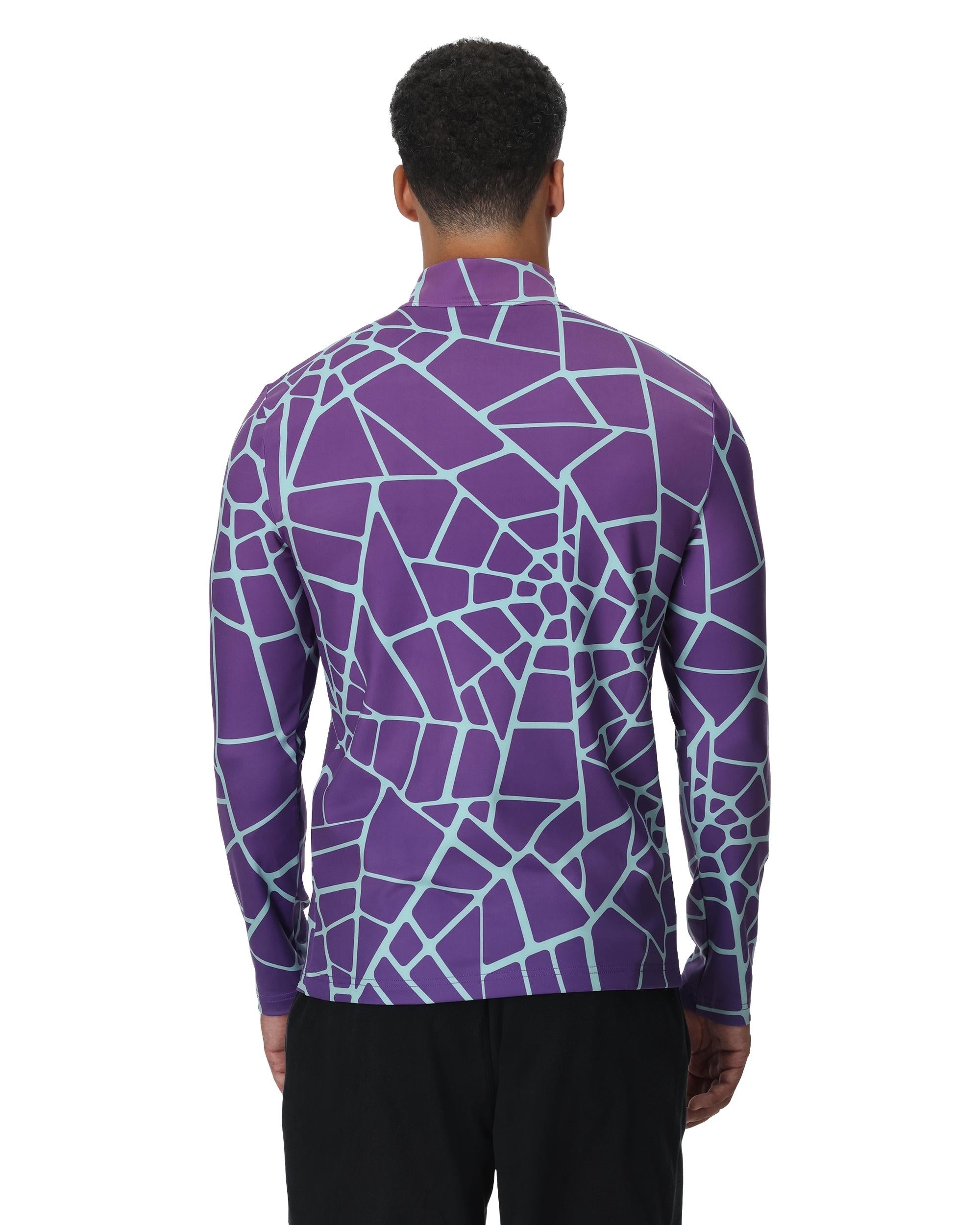 Man wearing a purple geometric patterned long-sleeve shirt on a white background