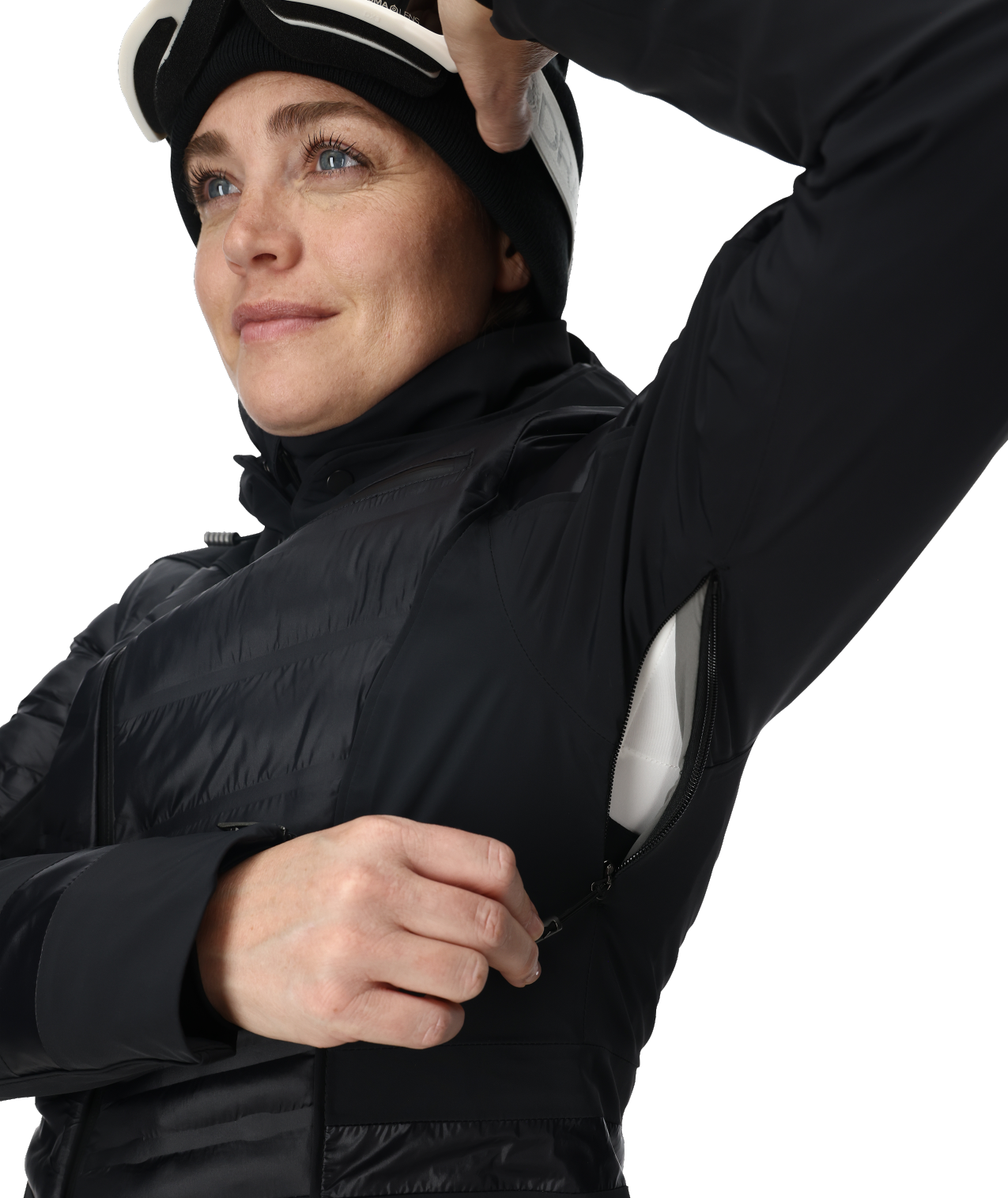 Experience the peak of elegance and technical excellence. The body fabric of the all-new Granada features EXO SHIELD 30K, a specialized Spyder fabric boasting 30K/30K waterproofing/breathability and Durable Water Repellent for high performance. We placed welded baffles filled with 60 grams of synthetic down PrimaLoft® Gold ECO insulation in the core to enhance warmth and prevent cold spots, while the interior velour stretch panels let you move with ease. Paired with YKK® underarm ventilation zippers, you can dump heat quickly in high-output moments. The Granada also features waterproof YKK® AquaGuard® exterior zippers, fully taped seams, an adjustable and removable hood, a removable snap-back powder skirt, and RECCO® Avalanche Rescue System. The Granada is an ideal choice for those seeking elegance and performance.