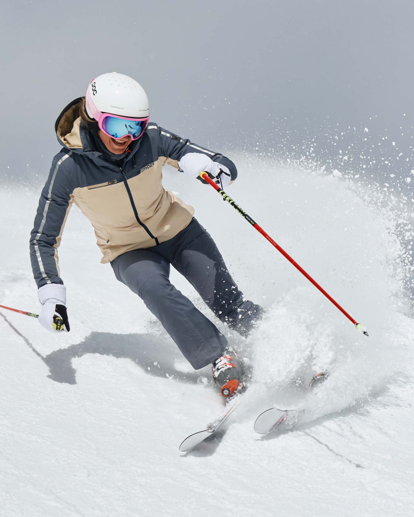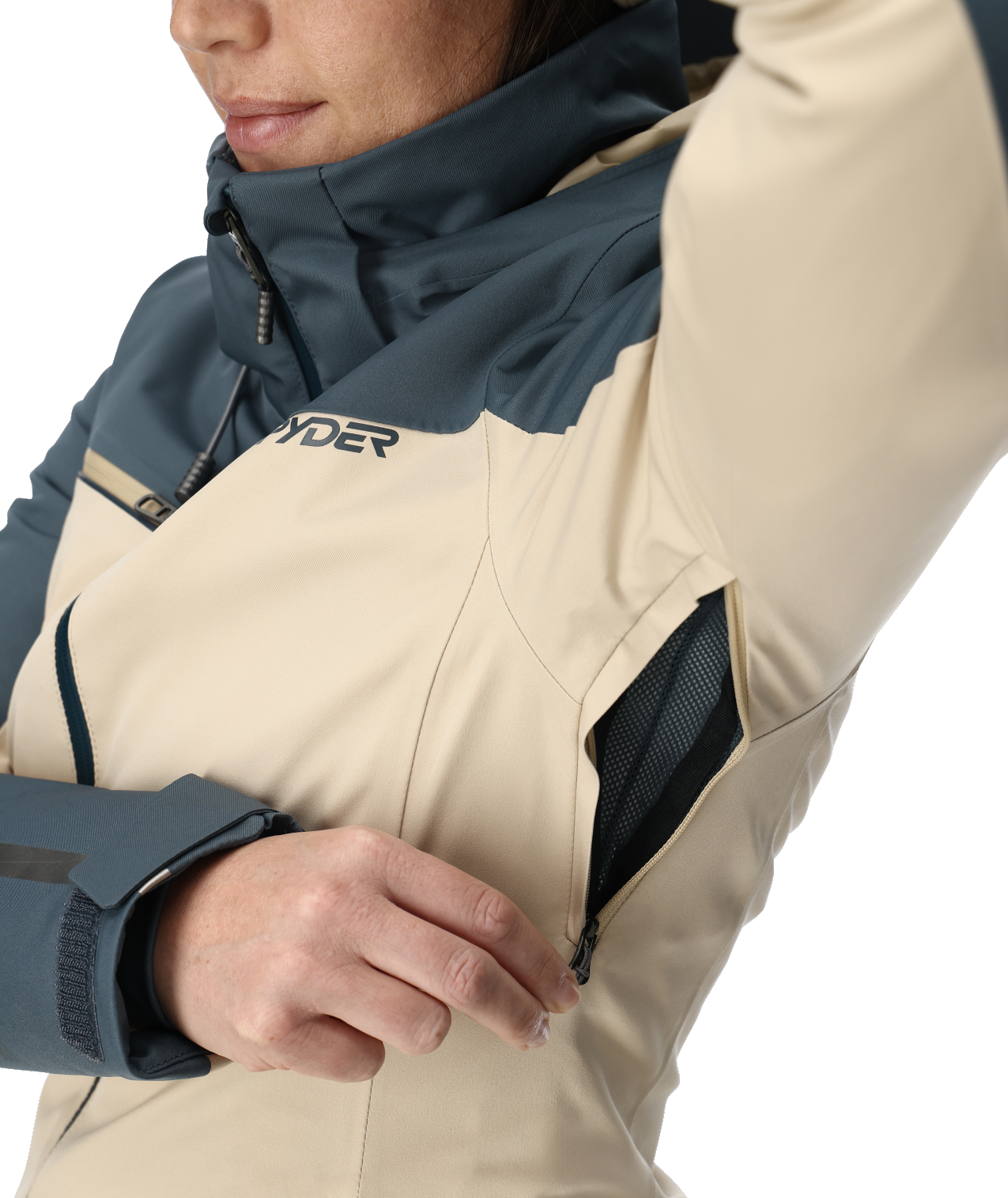 Close-up of a person wearing a blue and beige Spyder jacket.