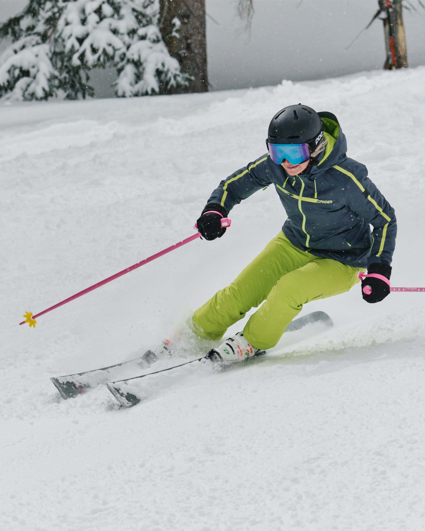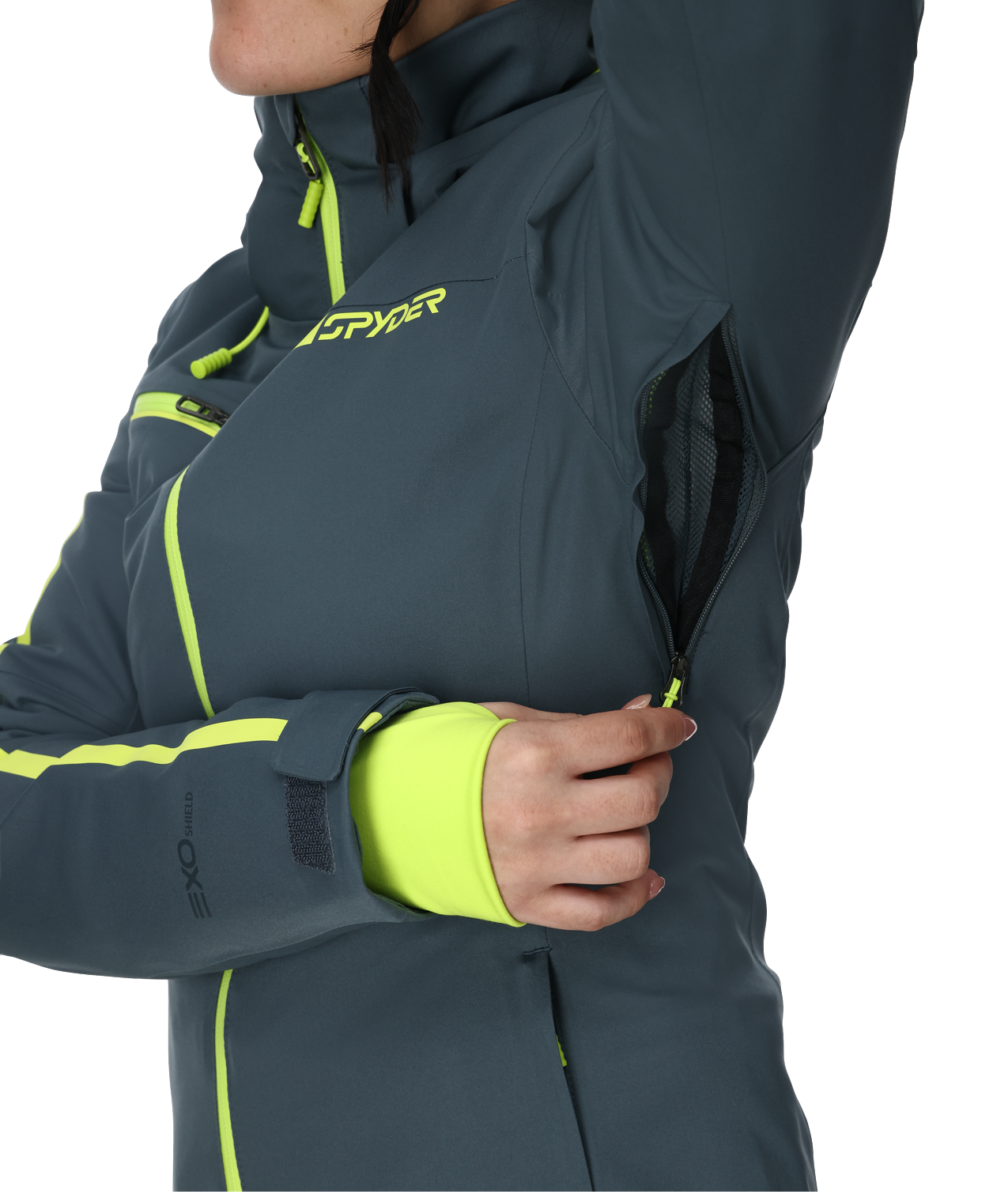 Person wearing a gray jacket with green accents, featuring Spyder branding.