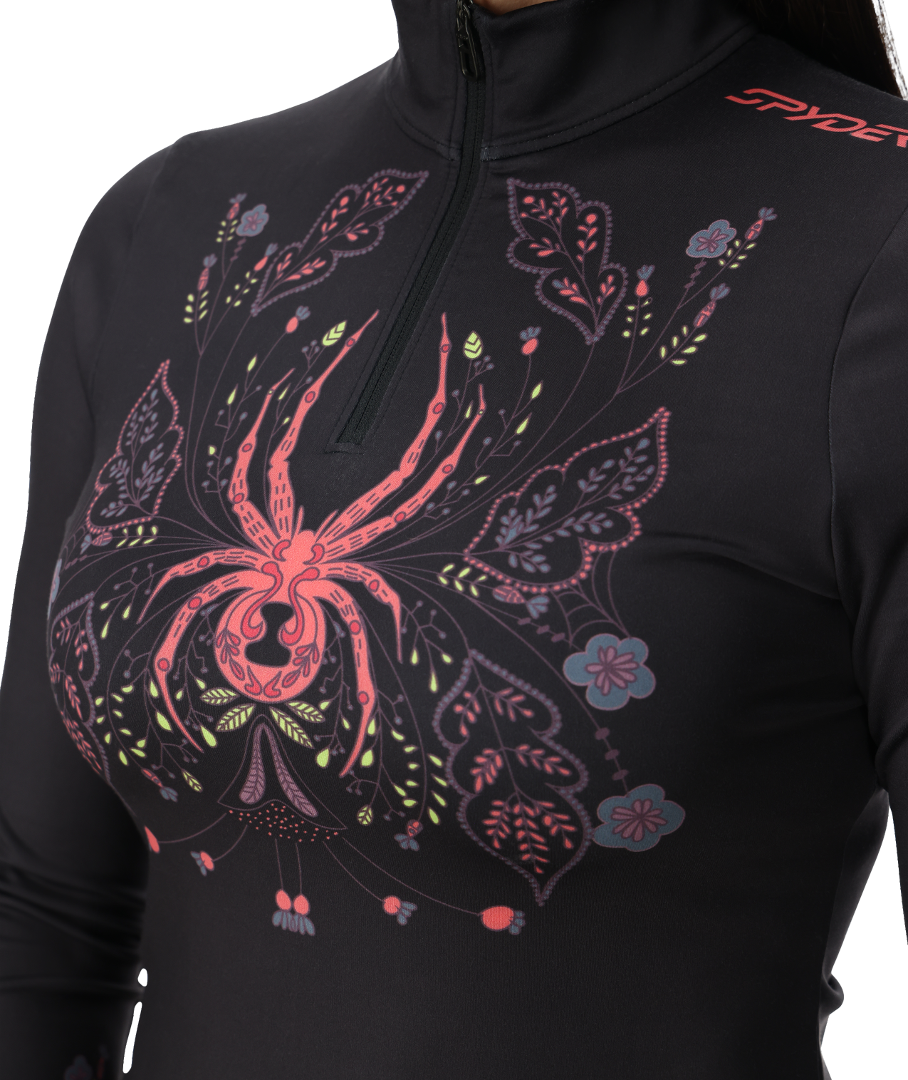Woman wearing a black long-sleeve top with a colorful spider design on a white background
