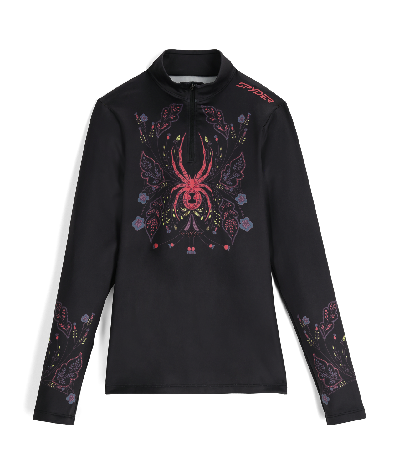 Black hoodie with colorful spider design and 'Spyder' branding on a white background